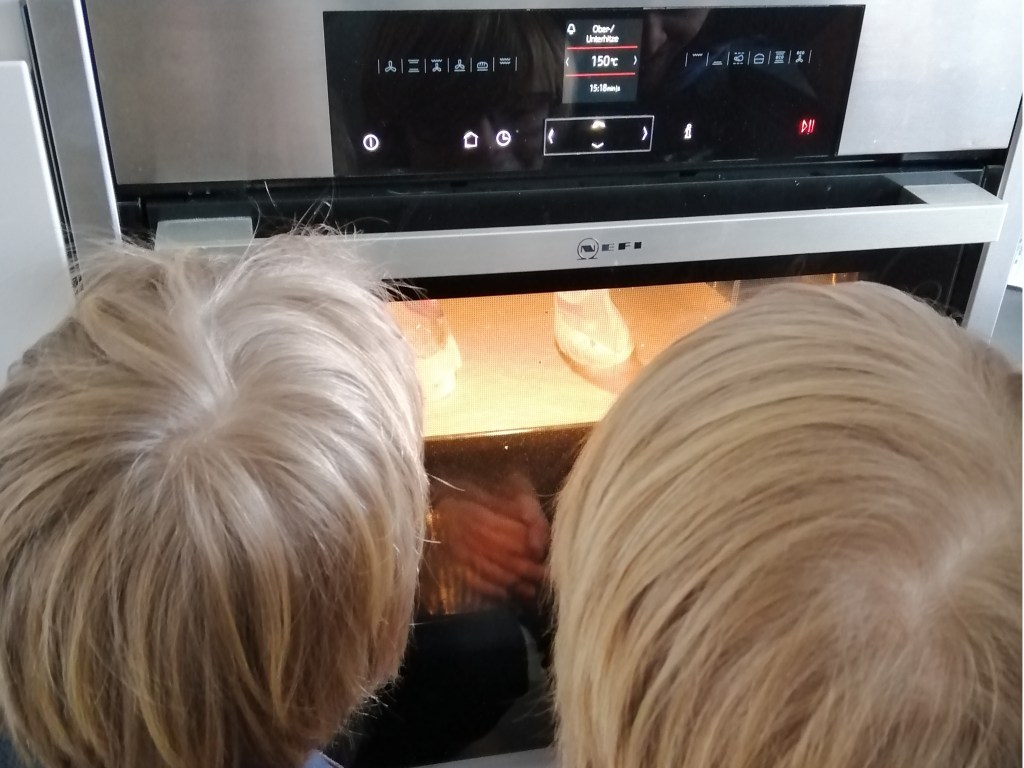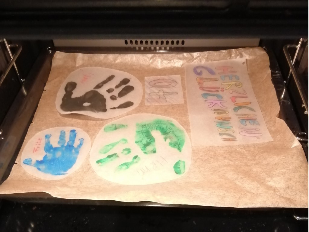 5. Warten – am besten vor dem Ofen und zuschauen, wie die Schrumpffolie sich verändert. Das ist total interessant für die Kinder. Während die Folie zusammenschrumpft, wird das Motiv ganz zerknittert. Beim ersten Versuch dachten wir, es wäre etwas schief gelaufen. Dann glättet die Folie sich aber von ganz allein und das Ganze dauert insgesamt nur etwa zwei bis vier Minuten. Ist alles schön glatt, dürft ihr das Kunstwerk aus dem Ofen holen – die Nicht-Saarländer dürfen es natürlich auch raus nehmen 😉